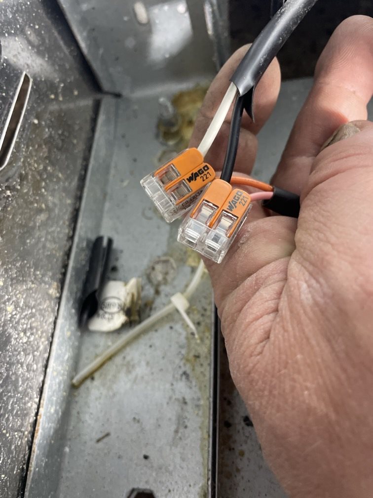 For the repair, we installed new lever-style electrical connectors designed to maintain consistent pressure on the conductors. These connectors help prevent loosening and reduce resistance, which keeps heat buildup under control. We then carefully routed and secured the wires inside the compartment so they stayed clear of sharp edges and moving parts.
