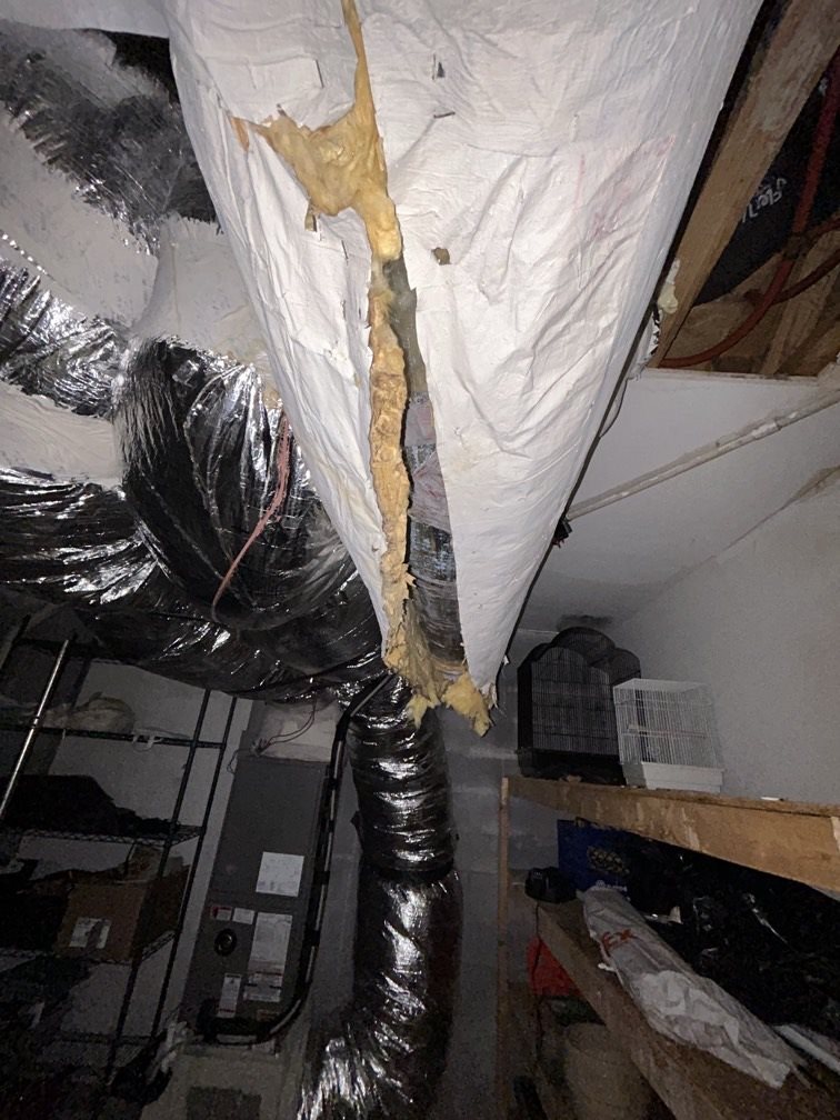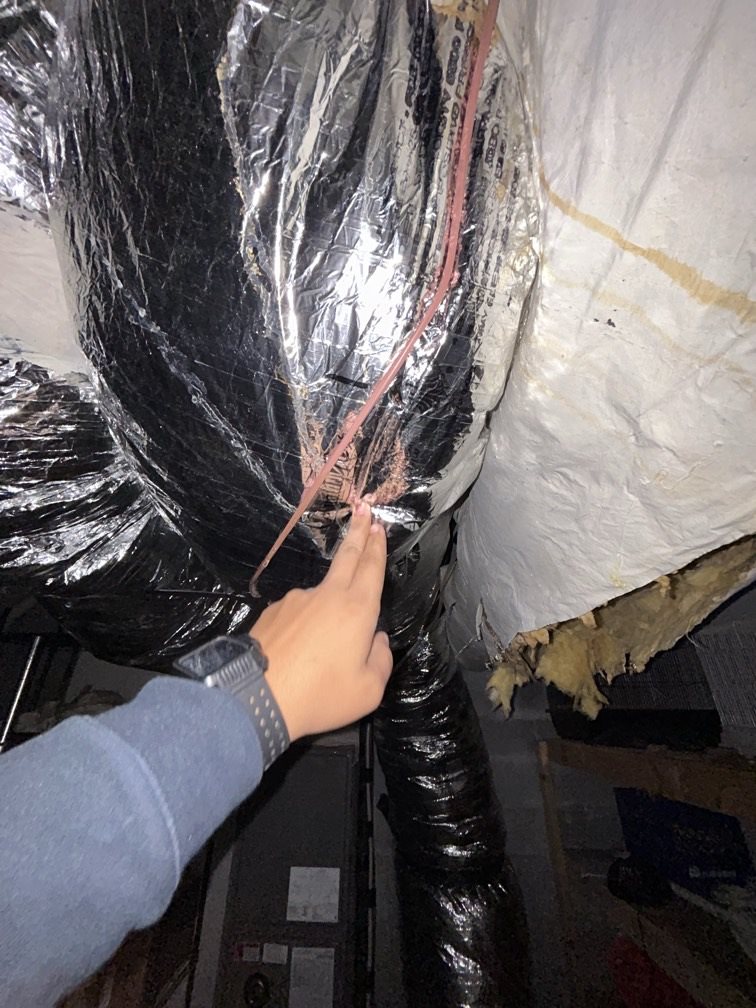 We found clear chew marks and openings where animals had eaten straight through the duct jacket and insulation. Those tears allowed conditioned air to escape into the crawl and utility spaces instead of reaching the living areas. They also pulled humid air into the system, compounding the moisture issue already present in the home.